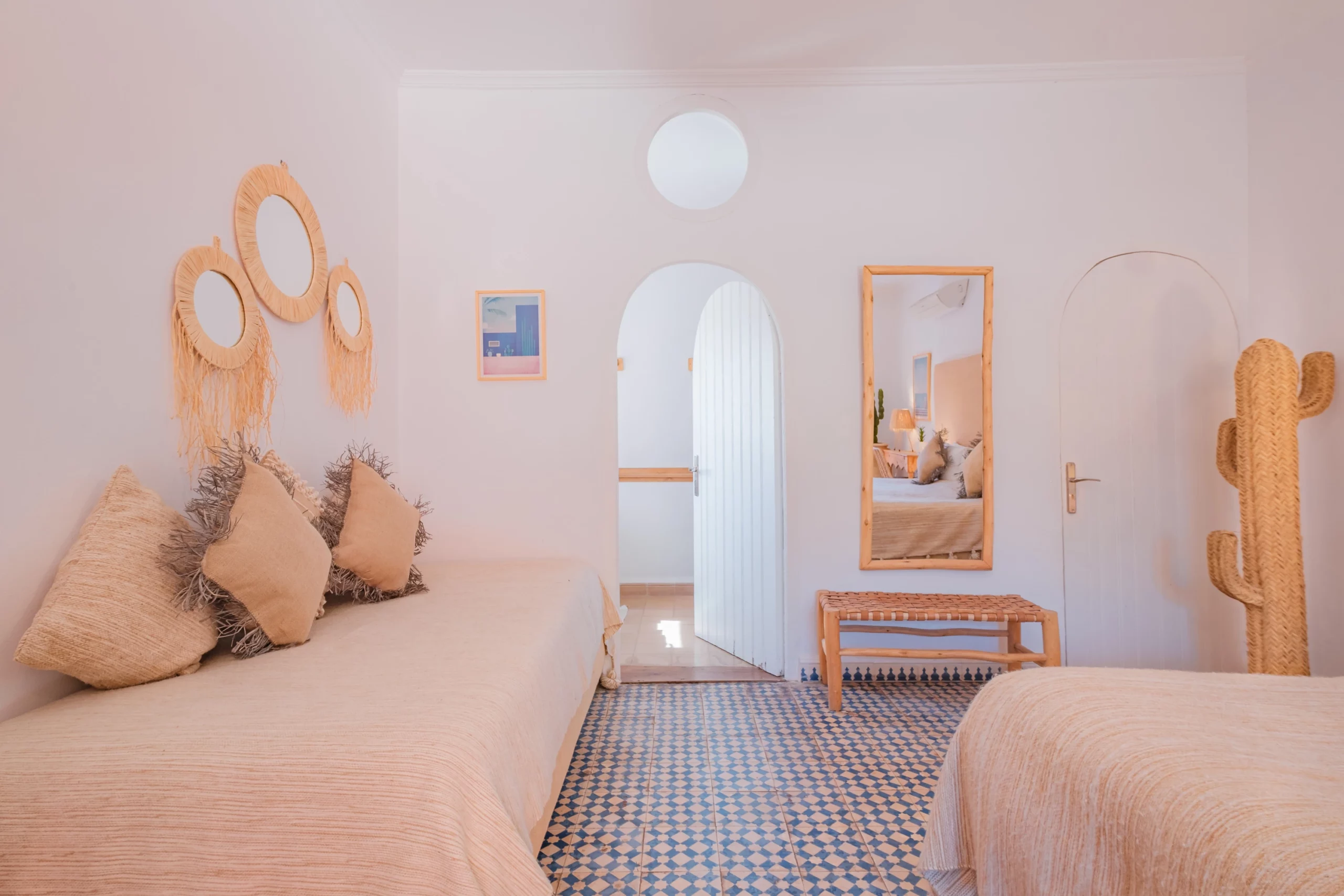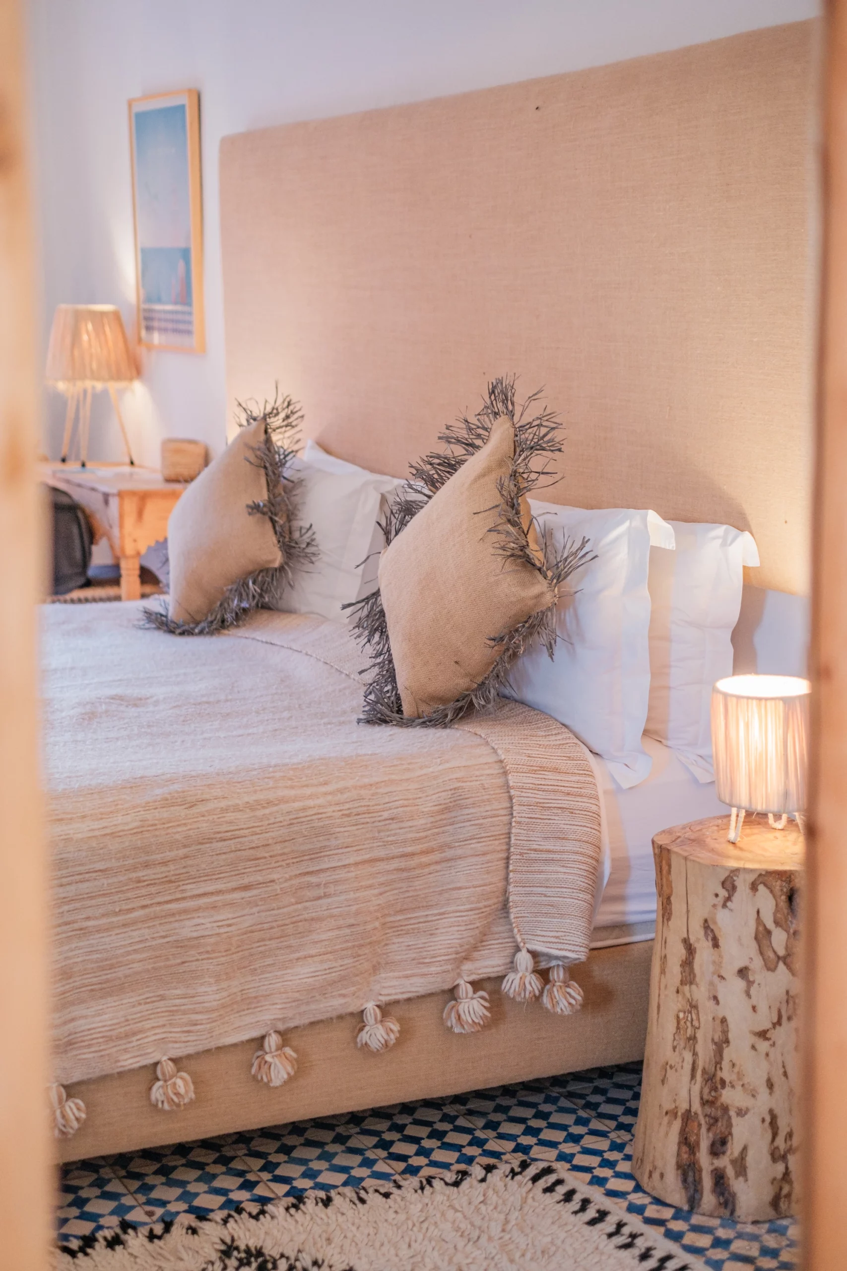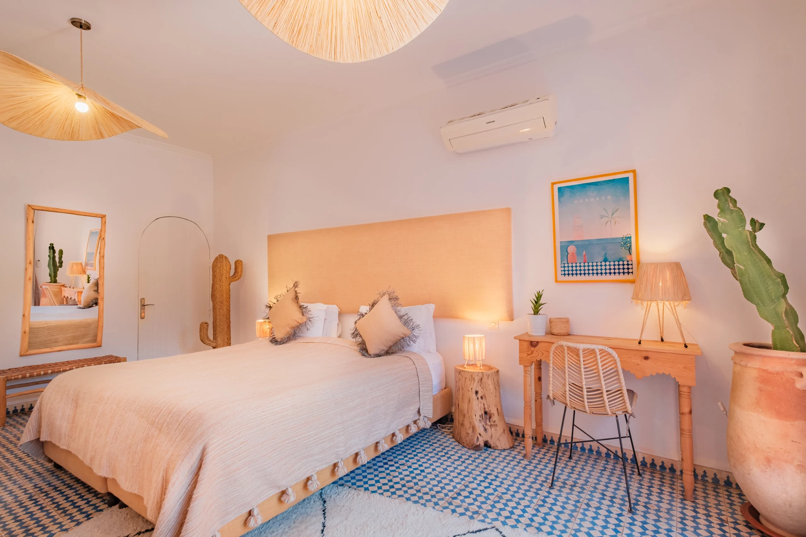 The little extra… Its decoration which showcases the local know-how: traditional cement tiles, wicker baskets, raffia lighting fixtures…