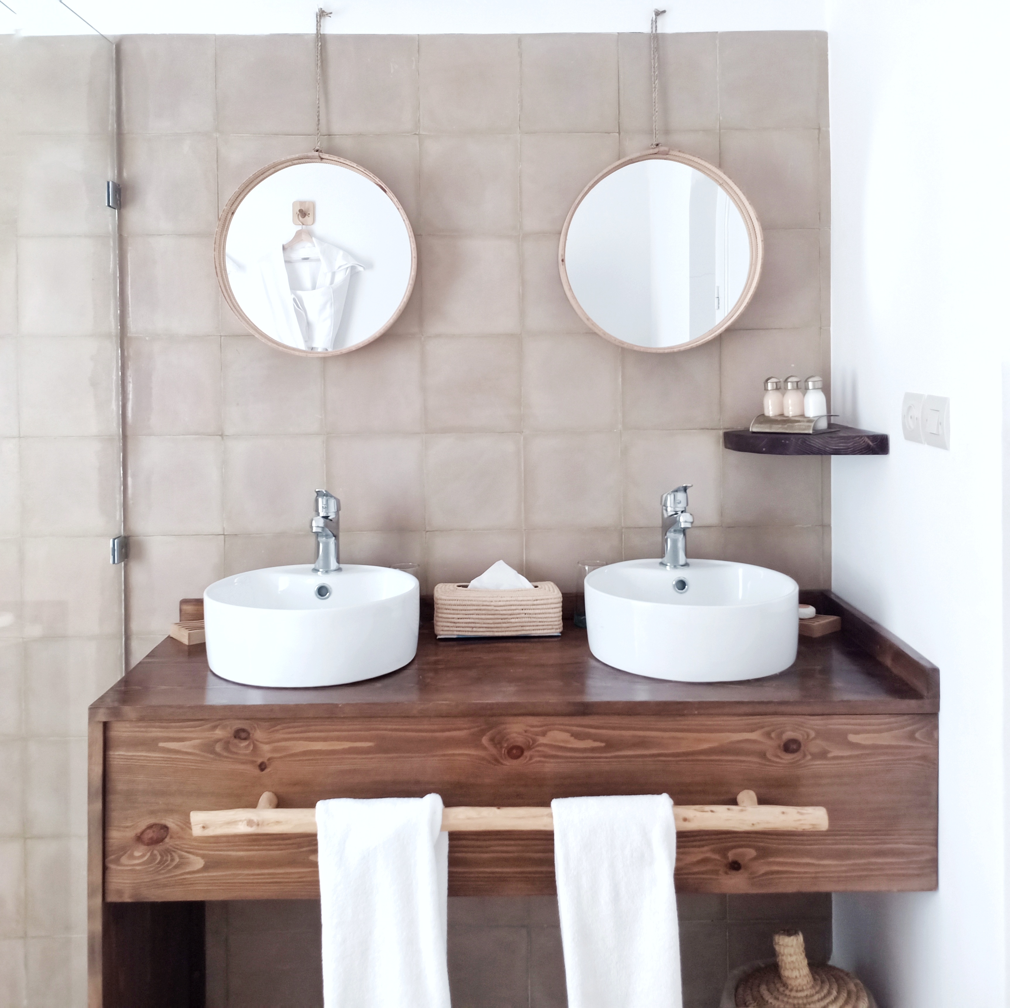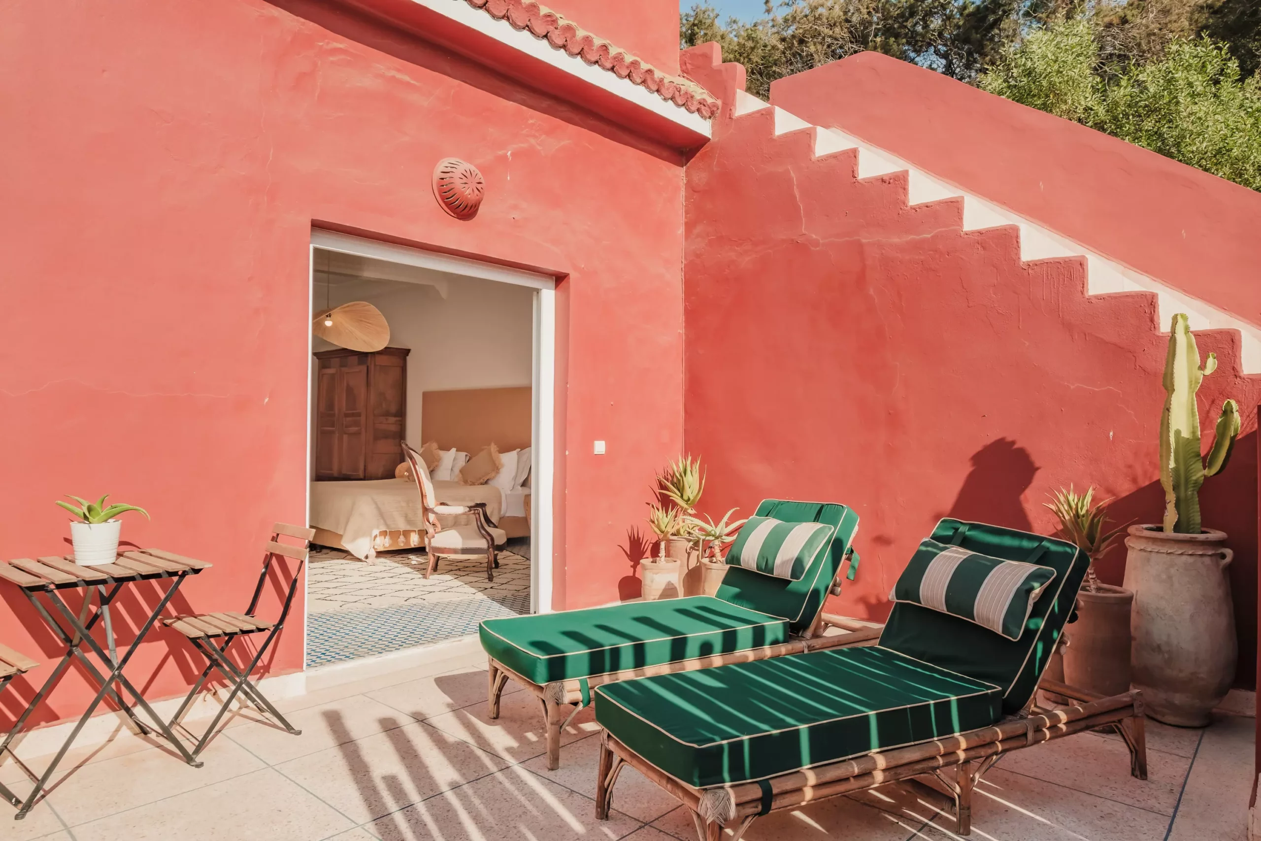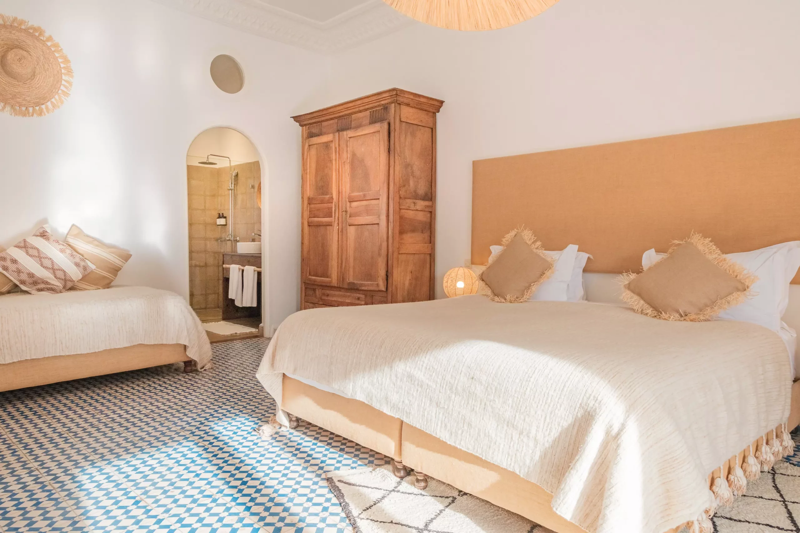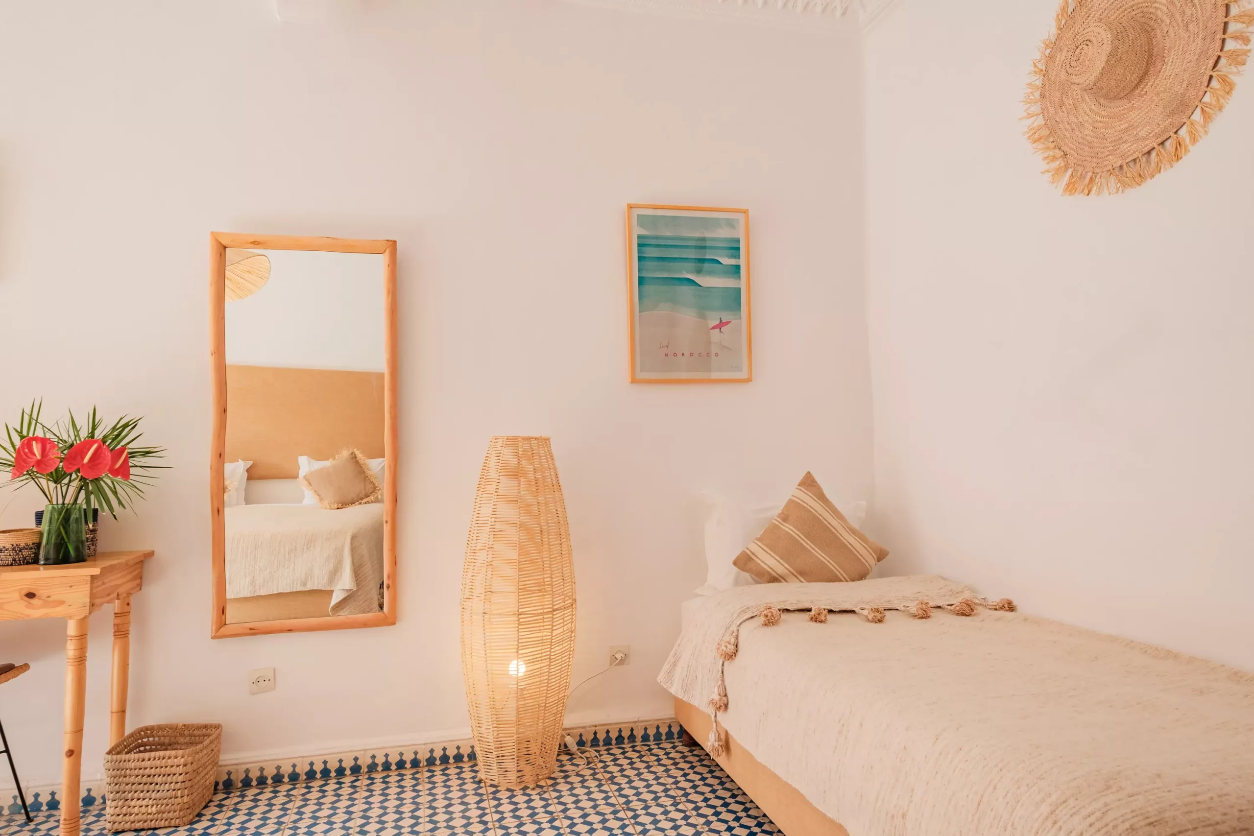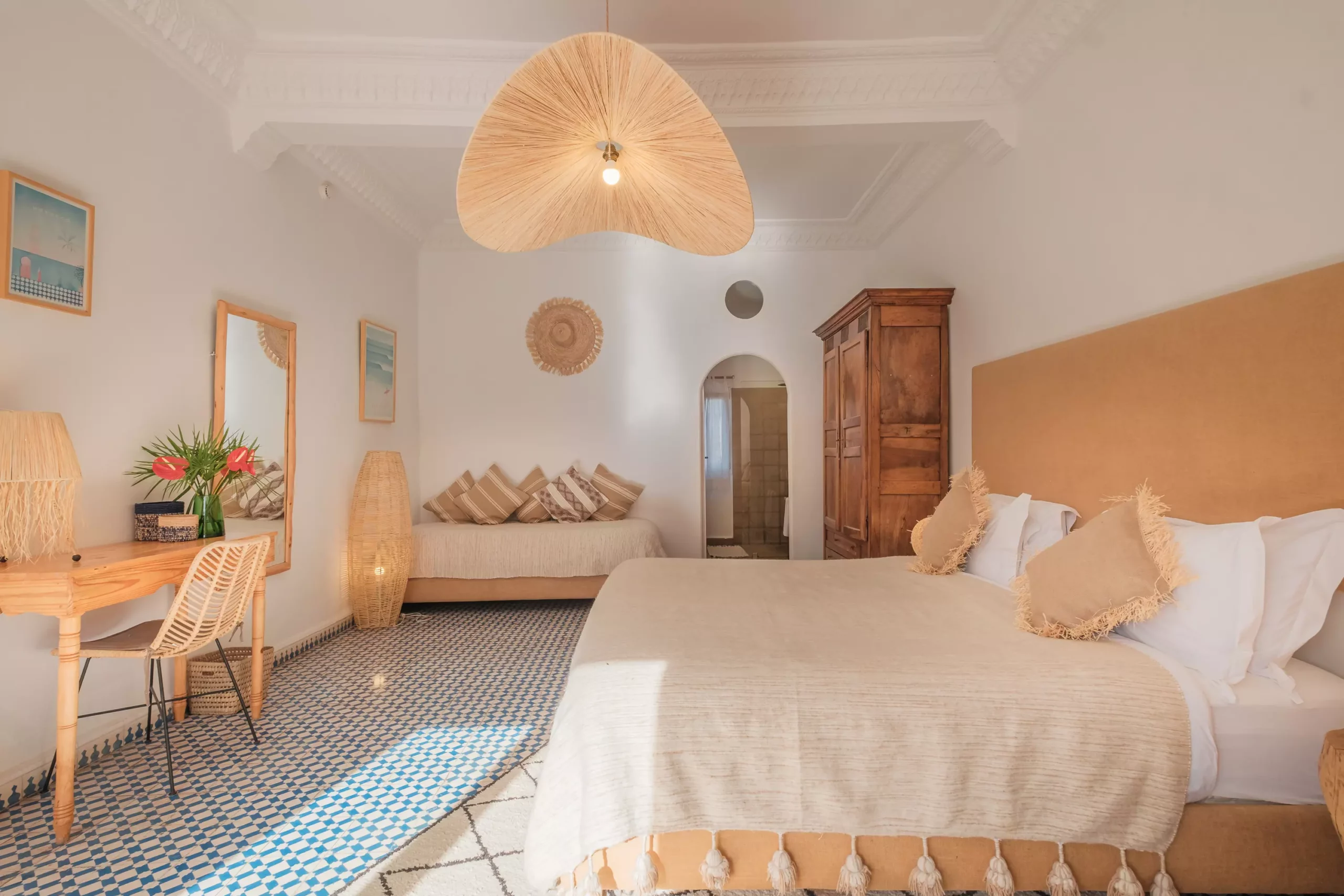 Raphia is one of the Villa’s superior rooms. It gets its name from the plant, the braided fibers of which are used to ornate lighting fixtures and mirrors. With its small lounge area and its private terrace protected from the wind, it is ideal for a couple or a family of 3.
