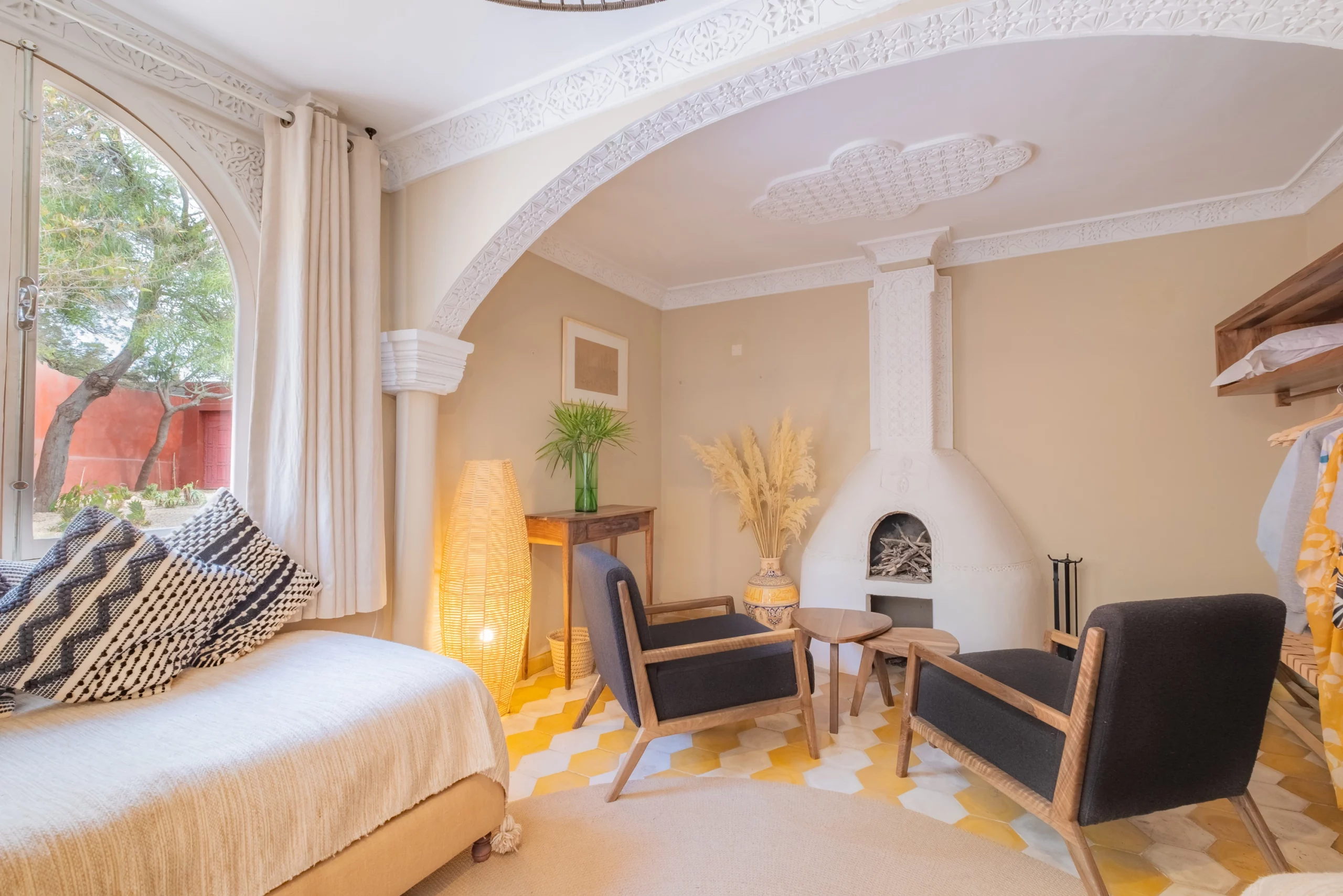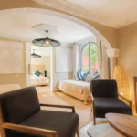 Situated on the first floor of the main building, the suite Créole is particularly luminous with its large bay window opening onto a private terrace. Composed of a spacious bedroom and a lounge area with a fireplace which can be transformed into a kids’ room, it is ideal for a couple or a family of 3 or 4 looking for rest and privacy.