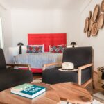 Avec ses tissus rouges et ses toiles « tropicalistes » la suite les Saintes est un clin d’œil à l’univers coloré du peintre Didier Spindler, ancien propriétaire de la Villa. Au mur, vous pourrez d’ailleurs découvrir deux de ses œuvres.