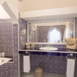 Situated in the heights of the property, the suite Majorelle is luminous and spacious as well.It has a separate television lounge, and a beautiful fireplace in blue zellige. Its large bathroom in traditional ceramic is equipped with a bathtub and a shower.