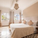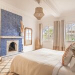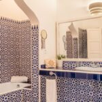 Située sur les hauteurs de la propriété, la Suite Majorelle est à la fois lumineuse et spacieuse. Elle dispose d’un coin télévision indépendant et d’une belle cheminée en zellige bleu. Sa grande salle de bain en céramique traditionnelle offre quand à elle baignoire et douche.