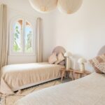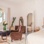Au premier étage de la bâtisse principale, surplombant le parc et la piscine, la Suite Marie Galante est à la fois spacieuse et lumineuse. Sa décoration met à l’honneur les matières naturelles : tête de lit & tables de nuit en bois d’eucalyptus, luminaires en raphia & osier, tapis en laine…